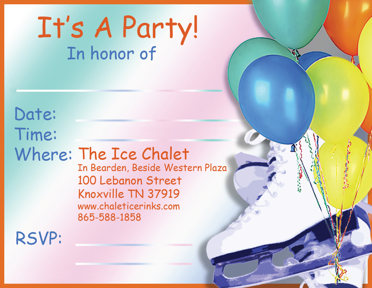 Regular Birthday Party: $ 210.00 covers admission and skate rental for nine (9) skaters plus the birthday person (total of 10 skaters), and reservation of a warm party room for 1.5 hours. Skaters can stay for the full duration of the public session! For more than 10 skaters, each additional skater is only $ 7.50 each. We'll also assign a "birthday buddy" if you wish to help you and your guests have a fun visit! Our gift to the guest of honor: All birthday guests will receive a coupon for a free skate rental to use for their next visit ($ 7.50 value), and the birthday person receives an embroidered Ice Chalet patch! Please note there is a $ 7.00 online booking fee; no fee is charged for phone bookings: 865-588-1858. The non-refundable party fee must be paid in advance so that we can put your event on the calendar and reserve your room.